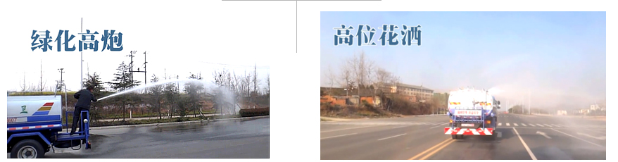 4.根据使用环境要求可选装前置电控洒水炮,实现远程遥控**,360度旋转无死角,后工作平台可加装喷雾机组,用于园林绿化部门给景观花木喷洒农药,也可将后喷雾炮调节成雾化状态,用于降温、降尘、净化空气作用。